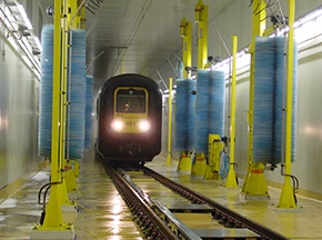 鐵路列車自動清洗機可實現(xiàn)對列車車廂、火車頭等外面進行全面、徹底的自動清洗,設備主要由噴淋系統(tǒng)、洗刷系統(tǒng)、干燥系統(tǒng)、水處理系統(tǒng)(選配)、預警系統(tǒng)及控制系統(tǒng)等組成,可通過噴淋濕潤、預備洗刷、洗滌洗刷、漂洗洗刷和吹掃干燥等不同的清潔方式,配合列車勻速通過清洗工作場地除去列車表面的塵埃和污垢,達到運營列車潔凈要求。[查看詳情]